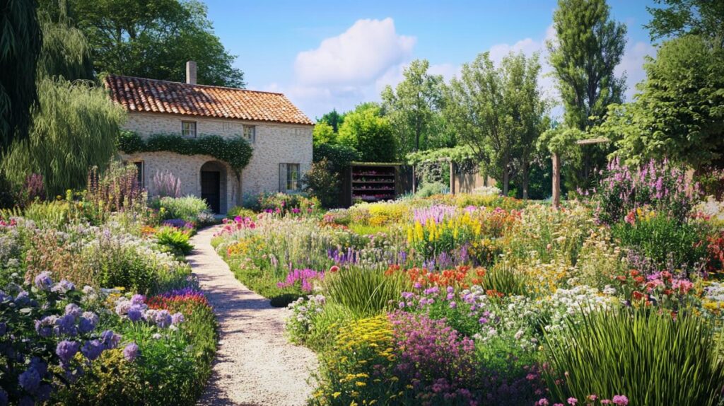 Un jardin romantique s'harmonise naturellement avec les éléments aquatiques, créant un espace où la sérénité règne. L'alliance entre l'eau et